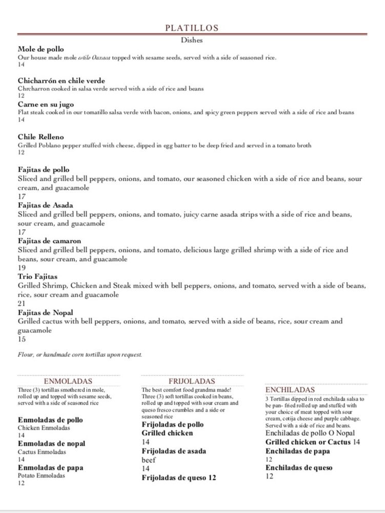 Grilled Cactus with bell peppers, onions, and tomato, served with side of beans, rice, sour cream and guacamole